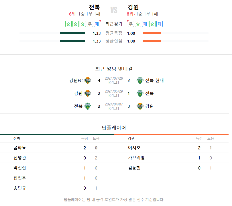 (상대전적은 최근 4경기 모두 강원이 승리했습니다.)