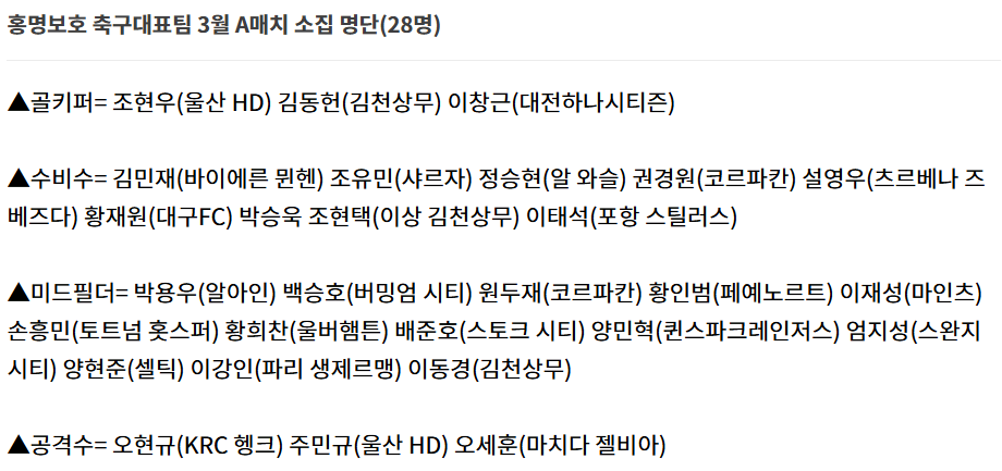 25년 3월 북중미월드컵예선 국가대표 소집 명단입니다.